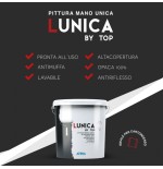 LUNICA BY TOP è un’idropittura mano unica di nuova generazione, formulata con polimeri acrilici in emulsione acquosa e pigmenti stabili alla luce, pensata per ottenere copertura totale in una sola applicazione, con una finitura opaca antiriflesso, lavabile, antimuffa e funghicida.